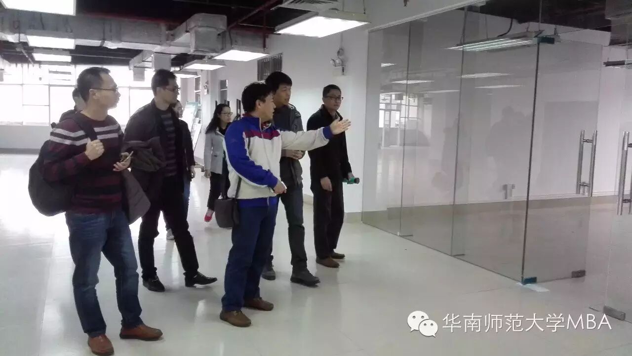 12月20日,华南师范大学MBA中心蒋峦副主任和华师MBA联合会主席于文杰以及2014级MBA学员等17人,来到华师创业学院众创空间参观考察,项目负责人黄子健接待了考察组。