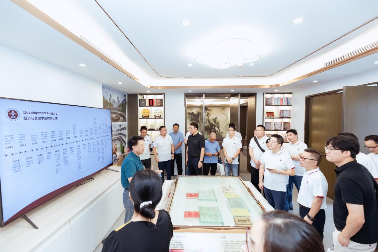 上午9时,学院副院长蒋峦亲自带队,引导校友们参观院史馆,并作精彩讲解。校友们跟随蒋院长的步伐,重温了经济与管理学院二十五年的发展历程,深刻感悟“经邦济世,管达寰宇”的文化底蕴。馆内一张张老照片、一件件珍贵展品,不仅唤起了大家对学生时代的美好回忆,也让他们对学院近年来在学科建设、人才培养和社会服务等方面取得的成就有了更加深入的了解。